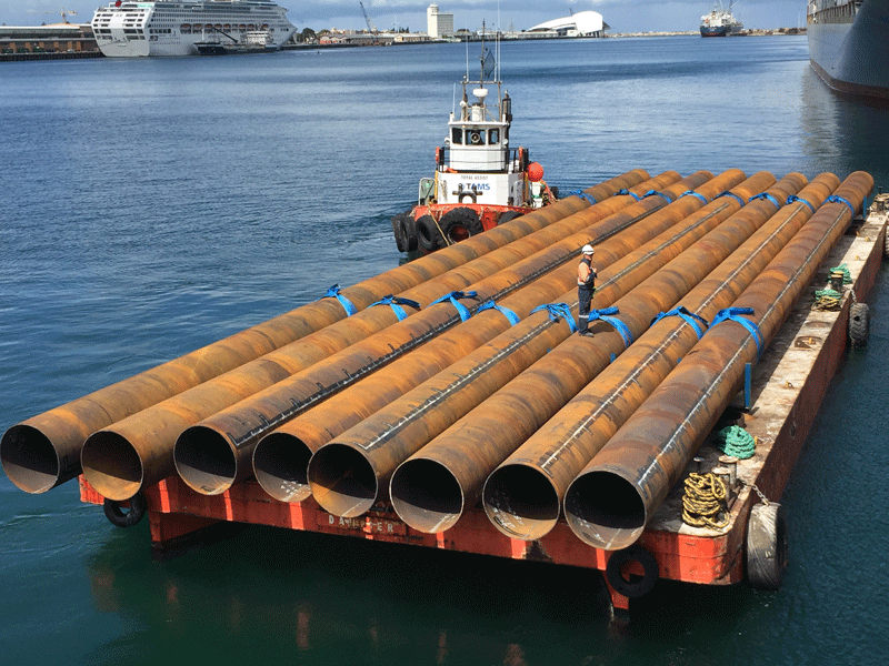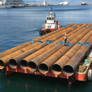 Hình ảnh cọc ống ván thép được vận chuyển và tập kết tại công trường do Công ty Fatech cung cấp